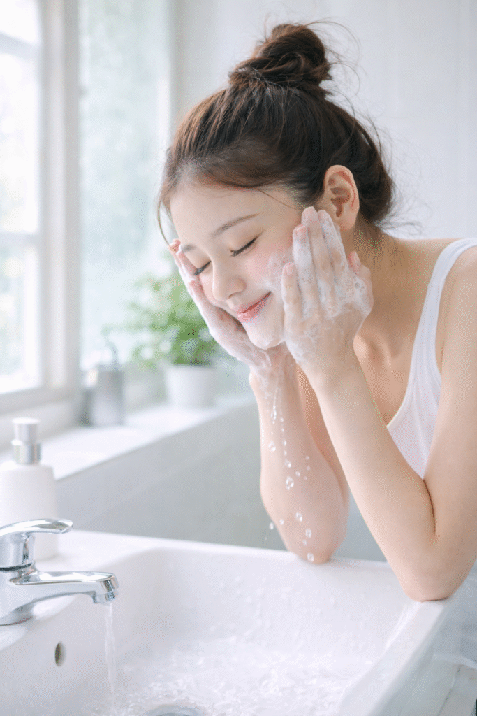Start your day by washing your face with a gentle face cleanser. This removes oil and dirt that build up overnight.